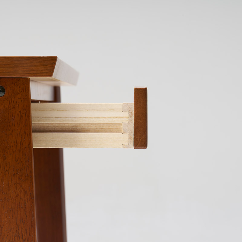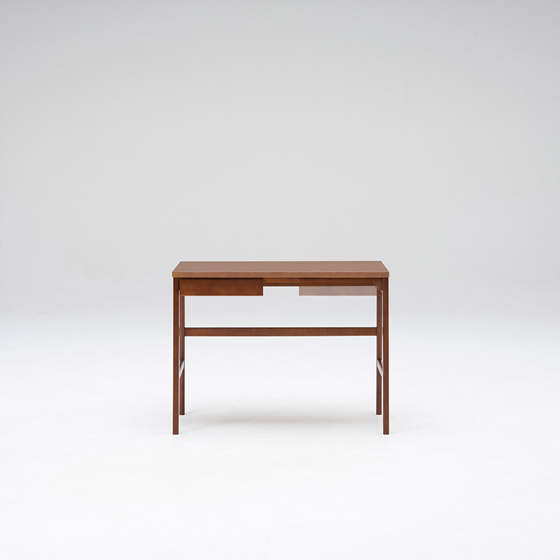 天板はオークの突板。デスク単体では幅90cmのコンパクトサイズですが、デスクとチェストを並べれば約122cmの天板に。引き出しは左右スライド式。一般的なデスクと比較すると高さ67.5cmと低く、リビングに置いても圧迫感が出にくいデザインです。