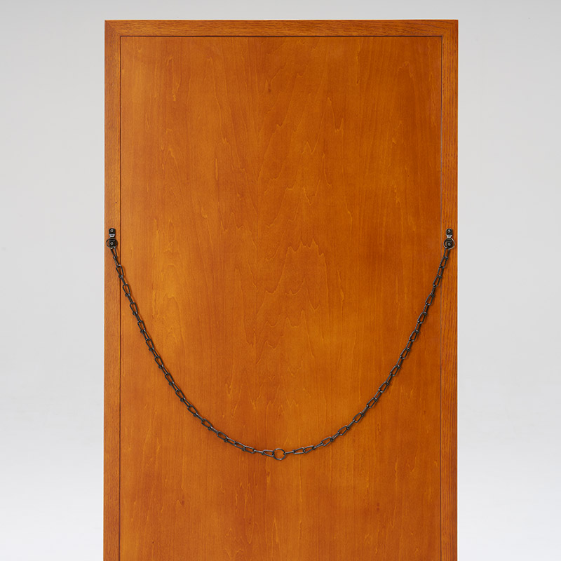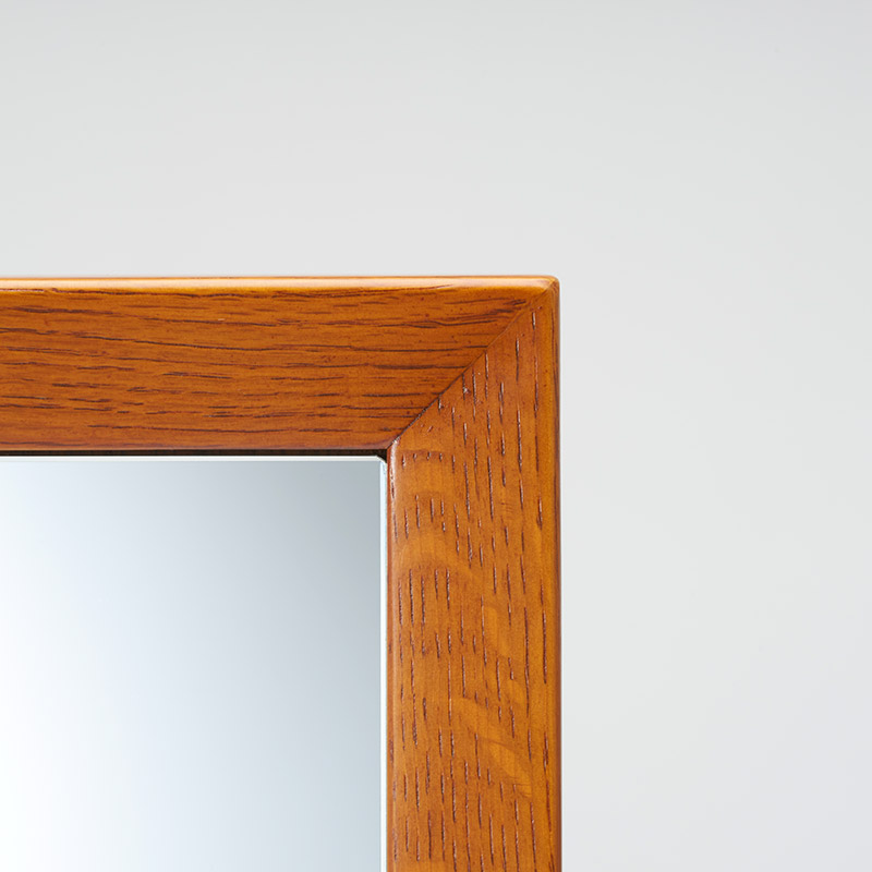幅広で全身が映せるサイズ。壁に立てかける仕様のため、底面は角度をつけています。サイドボードの縁のデザインがモチーフになっており、上質感のあるスタンドミラーです。